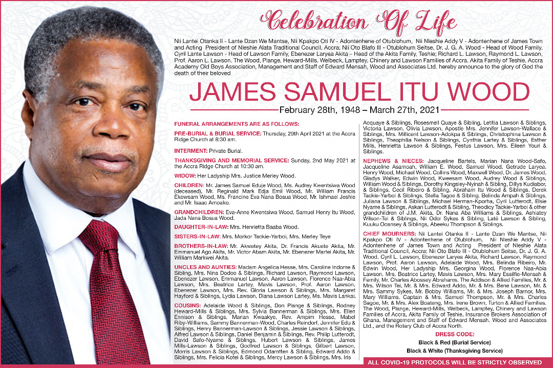 We thank God for the privilege this morning to say farewell to our nephew, brother, cousin, father, uncle, grandfather, husband and friend, James Samuel Itu Wood, whom God in His wisdom, has called home to eternal rest. His departure was too sudden for us; but to God, we give glory, honour and praise.